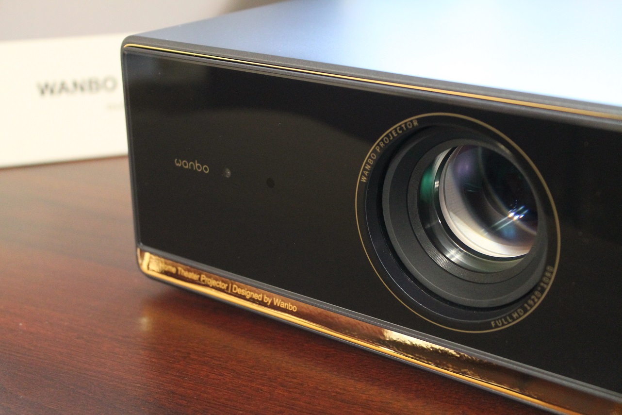 Проектор Wanbo Projector X5 Pro имеет классическую для проекторов компоновку с элементами дизайна, более характерными уже для Hi-Fi техники премиум класса. В нашем случае проектор выполнен в тёмно-синем исполнении корпуса с чёрной глянцевой передней панелью и золотой окантовкой под ней, также существует версия проектора белого цвета. На передней панели слева от линзы проектора можно разглядеть скрытый глазок камеры, используемой для автоматической подстройки изображения.