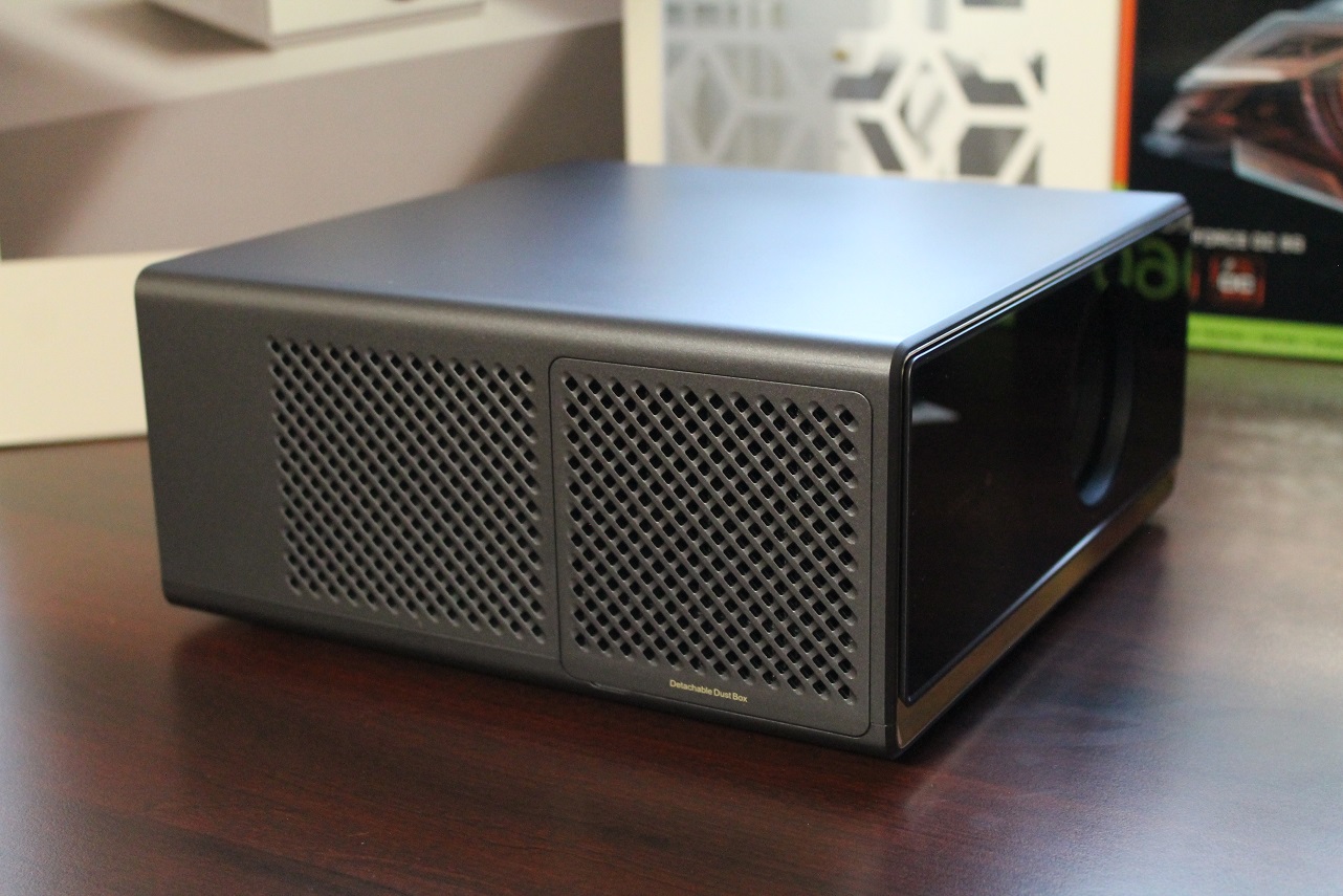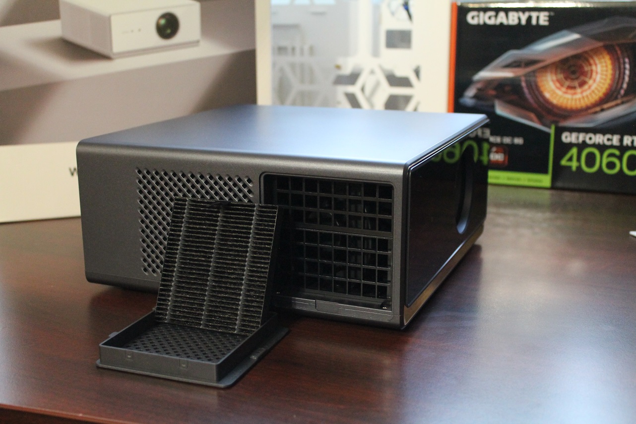На боковых сторонах проектора расположены вентиляционные решетки, выполненные весьма изящным образом. Если смотреть на проектор спереди, то с левого бока ближе к передней части есть снимающаяся часть решётки (крепится за счёт пазов и магнитов) с вынимающимся фильтром от пыли, который можно и нужно время от времени чистить. За фильтром расположен центробежный вентилятор, прогоняющий воздух для охлаждения компонентов работающего устройства.