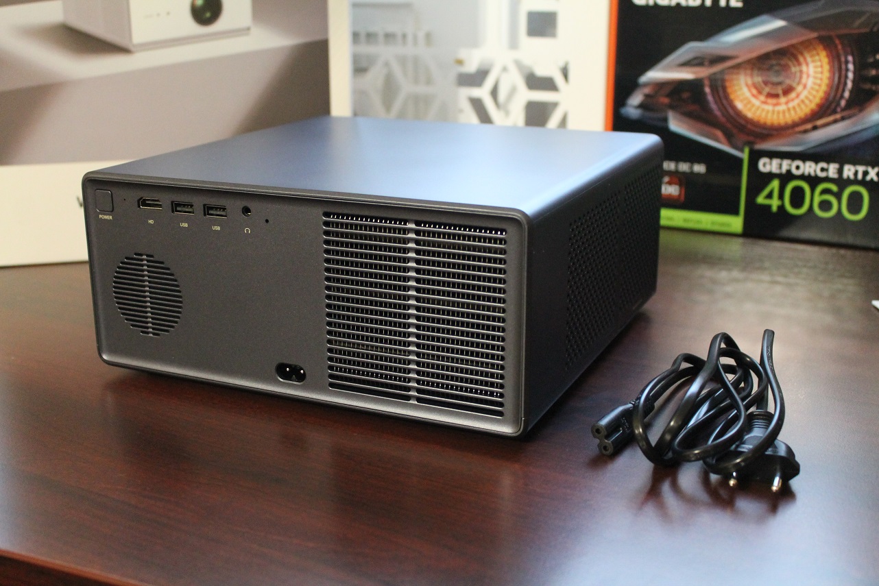 Вид на проектор сзади. На задней панели располагается кнопка включения, порт HDMI, два USB, 3,5 мм аудио и разъём для подключения кабеля питания