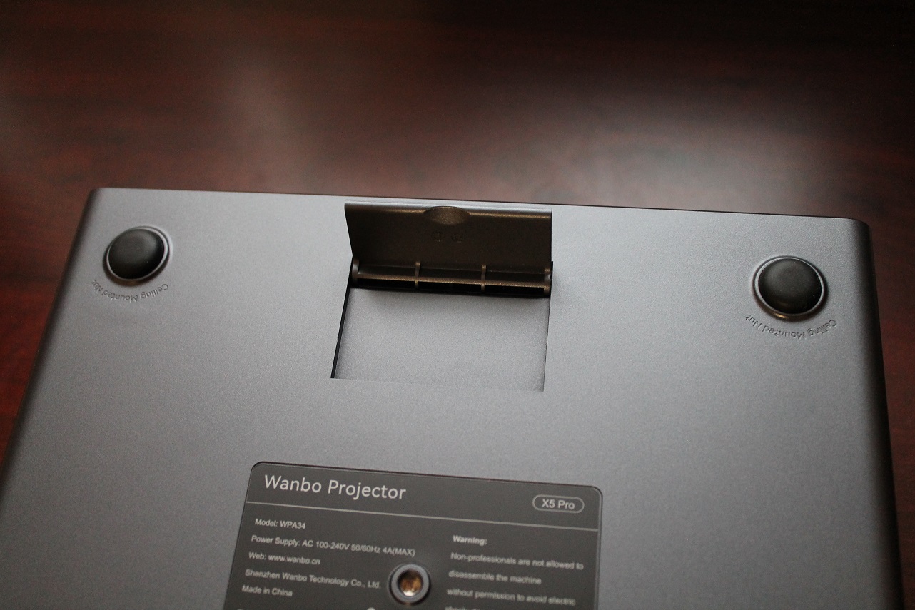 Спереди на нижней поверхности проектора имеется откидывающаяся подпорка, позволяющая установить его под углом 7 градусов к горизонту, тем самым «приподняв» изображение на экране (трапецидальное искажение при этом можно будет скорректировать в автоматическом режиме). На нижней панели по центру есть втулка с резьбой для установки проектора на штатив, а для установки на кронштейны предусмотрены ещё четыре втулки, находящиеся под резиновыми ножками, на которых проектор стоит в обычном положении. Расстояние между резьбовыми втулками на местах ножек составляет 195 мм по длине и 200 мм по ширине.