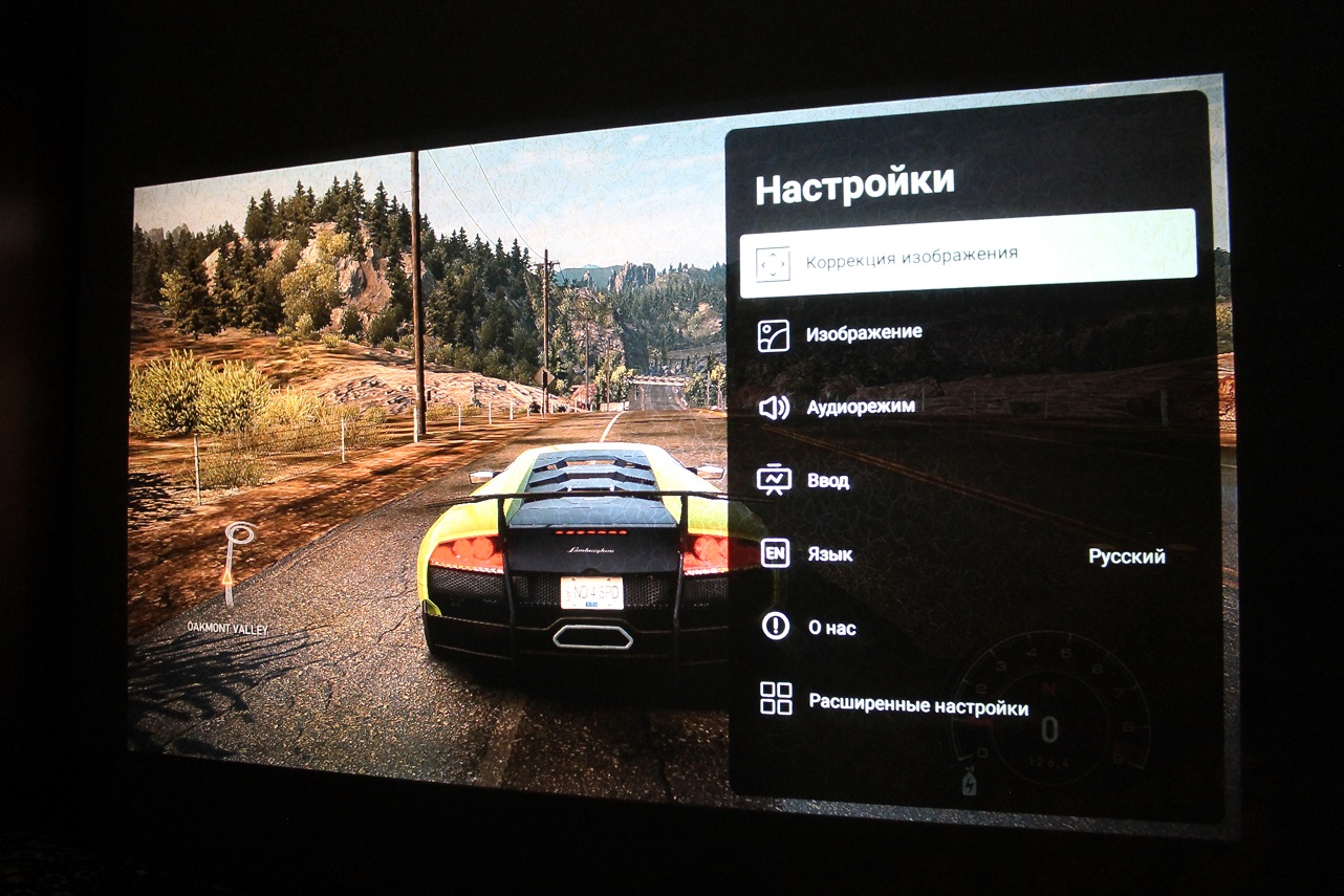 NFS: Hot Pursuit 2010 года выглядит отлично и при проецировании на полстены. Меню настроек проектора простое и понятное, есть перевод на русский язык