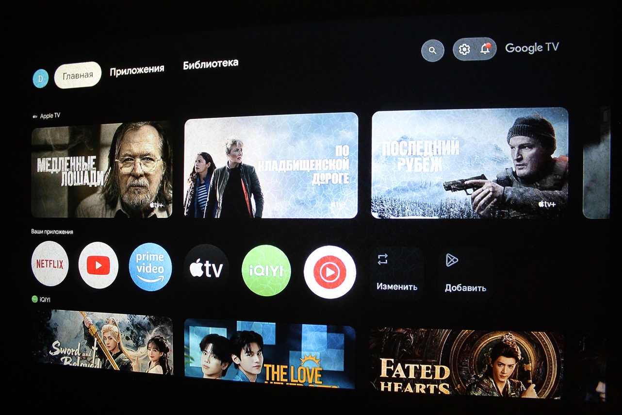А теперь вернёмся к настройке функционала Android TV, выбрав источник сигнала ATV, если до этого проектор работал в режиме HDMI или USB. Тут я избавлю себя и уважаемого читателя от детального описания десятка различных диалоговых окон с выбором языка, подключением к сети Wi-Fi, входом в аккаунт Google и согласием на обработку данных голосовым помощником, обновлением прошивки, разными настройками изображения и так далее. Прохождение всей этой полосы препятствий заняло у меня примерно полчаса с учётом скачивания обновлений прошивки. Процесс вбивания различных данных с помощью не совсем подходящего для этих целей пульта можно упростить, скачав на смартфон приложение Google Home для управления экосистемой умного дома и привязав к нему проектор, но в России оно оказалось не доступно. В целом же процесс настройки функций Smart TV пусть и не быстрый, но не сложный, стоит только проявить немного терпения и внимательности. Интерфейс «умного» телевизора на базе Android TV прост и интуитивно понятен, без каких-то изысков, требующих детального описания. Для быстрого доступа к сервисам YouTube, NETFLIX, Prime Video и Disney+ на пульте даже есть отдельные кнопки.