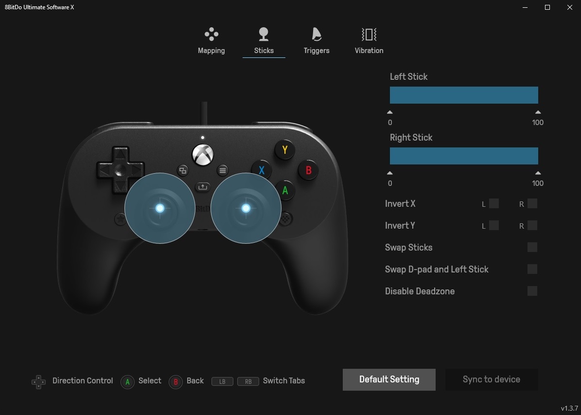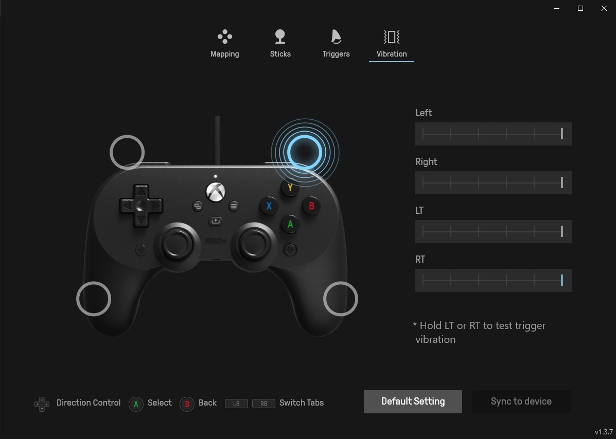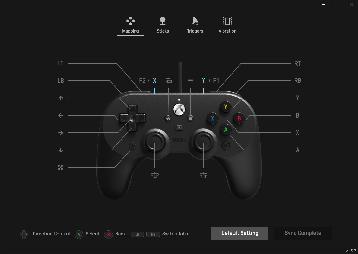 Скачать фирменное программное обеспечение, которое позволит гибко настроить наш геймпад и задействовать его расширенный функционал, можно в разделе загрузок на официальном сайте 8BitDo по адресу https://app.8bitdo.com/, конкретно нам нужна версия софта Ultimate Software X. Там есть ещё и другие, но именно эта поддерживает работу с геймпадом 8BitDo Pro 2 Wired Controller for Xbox. Ищем в списке нужную модель геймпада, после чего нас отправят в магазин приложений Microsoft. Устанавливаем ПО и видим четыре основных раздела настроек в виде кнопок в верхней части экрана: Mapping, Sticks, Triggers и Vibration.