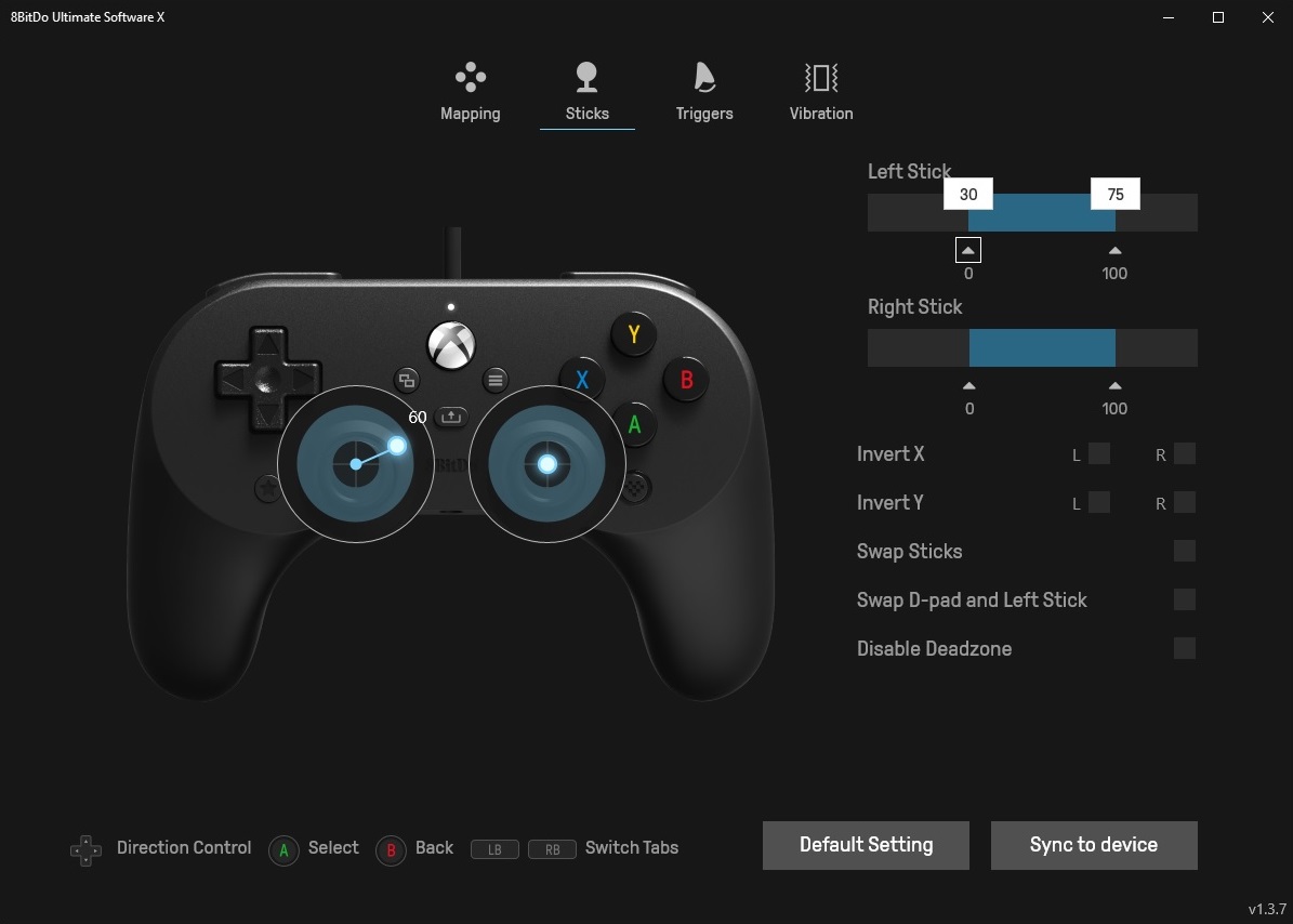 Здесь мы установили считываемую область в диапазоне от 30% до 75% физического хода стиков, благодаря чему управление в игре станет более резким