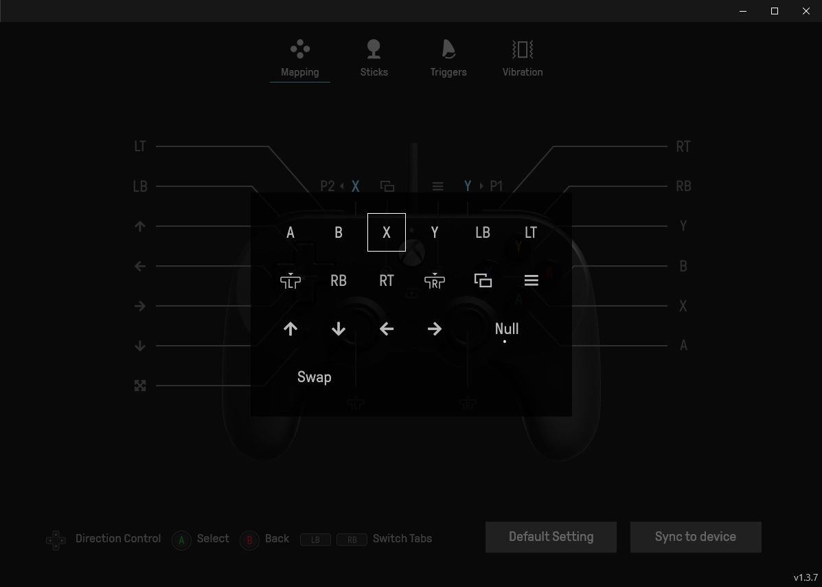 Mapping – в этом разделе можно настроить привязку функций к кнопкам геймпада. Проще говоря, переназначить раскладку кнопок. В том числе, можно «повесить» функцию какой-либо кнопки на расположенную под крестовиной небольшую круглую кнопку со звёздочкой. По умолчанию данной кнопке присвоен параметр Swap, отображающийся также в виде перекрещивающихся стрелок. Эта кнопка позволяет быстро менять местами функции любых двух кнопок, для чего необходимо зажать их и нажать на кнопку со звёздочкой. Также можно назначить на расположенные на обратной стороне геймпада кнопки-лепестки функции любых других кнопок по своему усмотрению. Обратим внимание на обозначения P2 и P1 над изображением геймпада – так тут обозначены левый и правый «лепесток» соответственно. По умолчанию у них стоит параметр N (Null), то есть, привязка отсутствует.