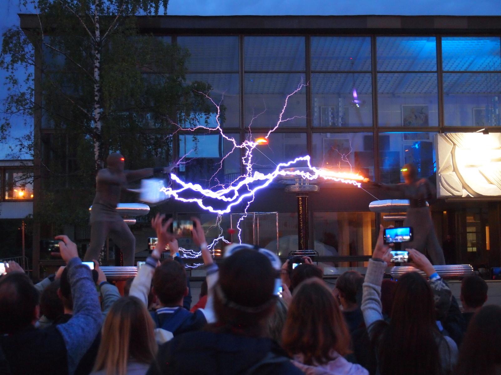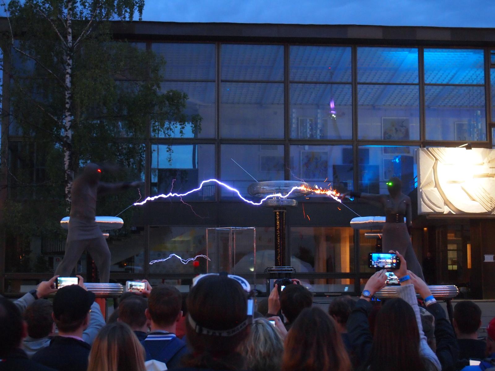 Завершился фестиваль электрическим шоу Tesla FX с катушками Теслы, выдающими молнии при напряжении 5 мегавольт при участии каскадеров в защитных кольчужных костюмах, выполняющих функцию клетки Фарадея.