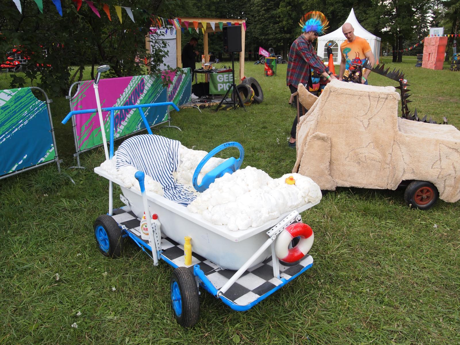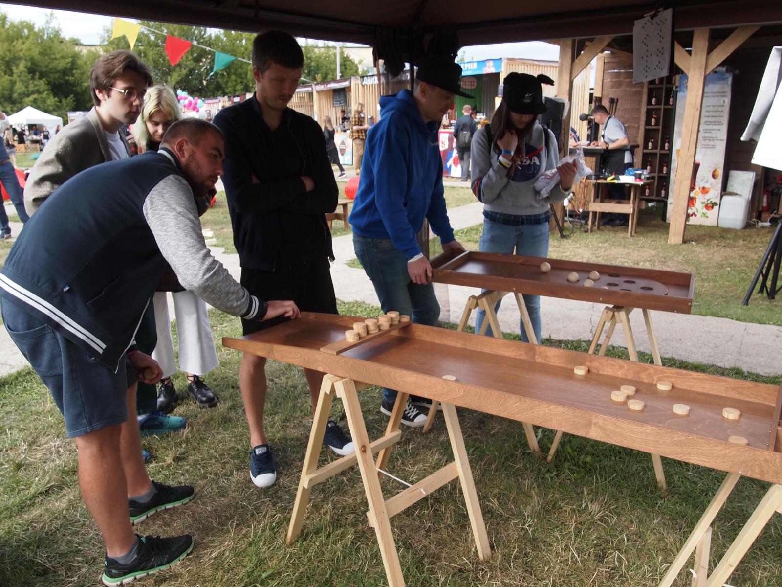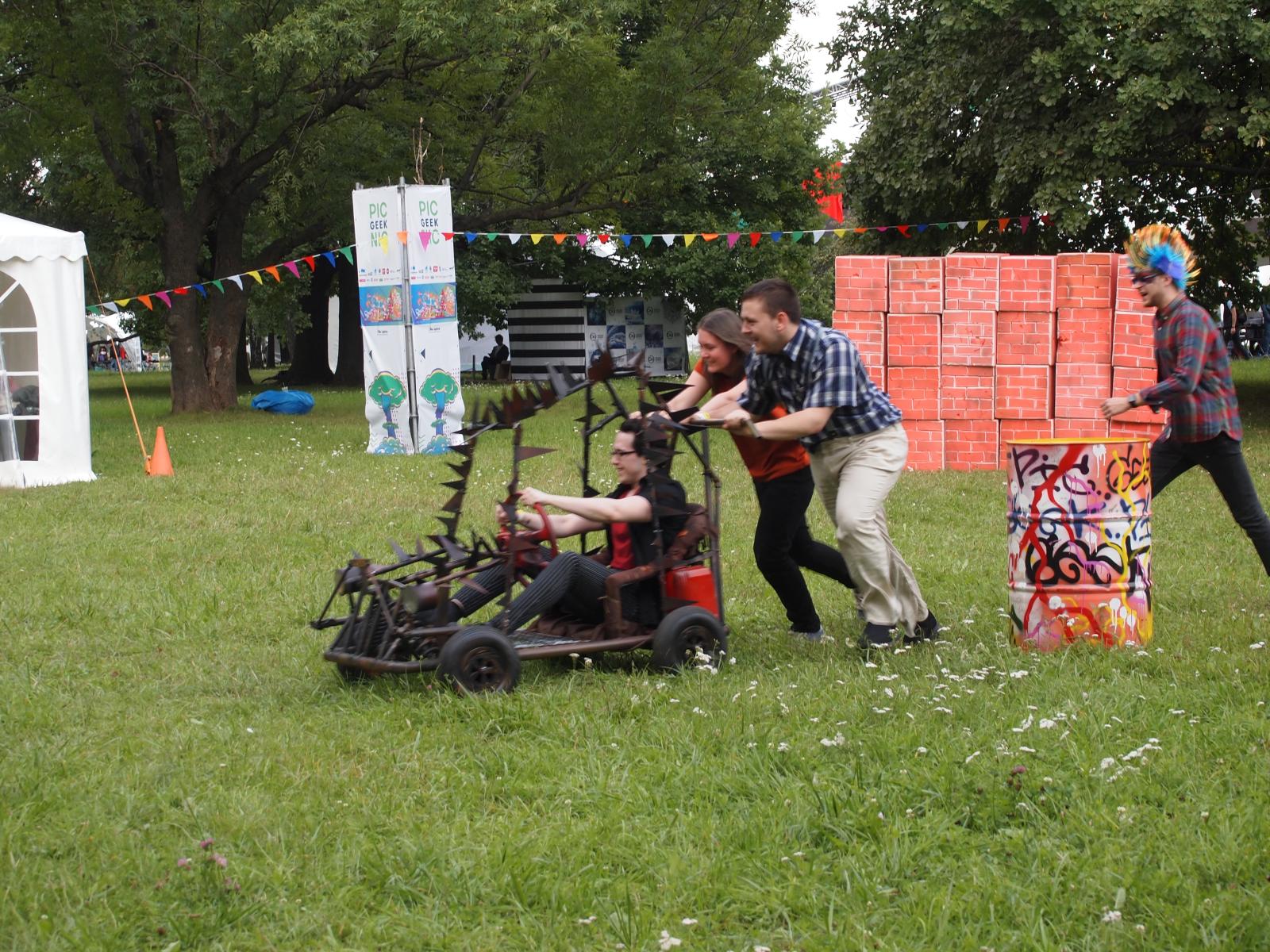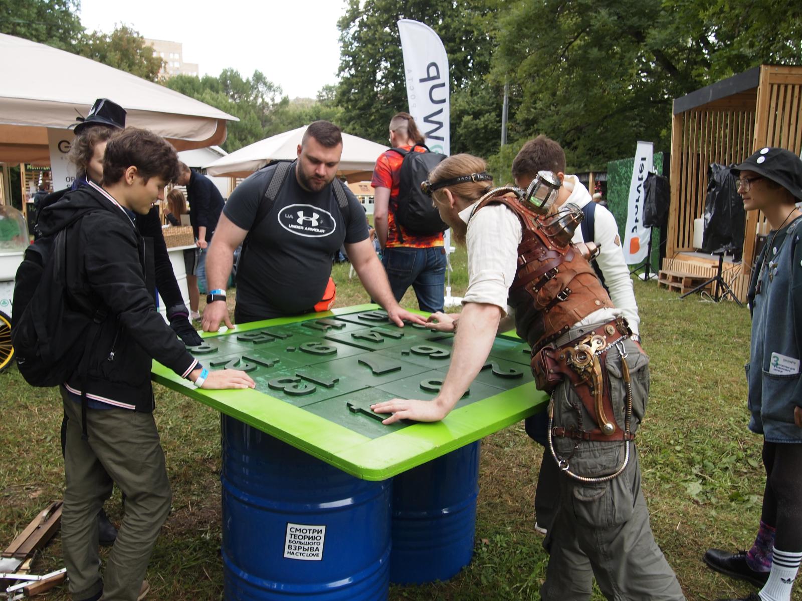 В целом, в этом году баланс фестиваля сместился в сторону науки и заметно возросло количество палаток-лекториев. Артобъектов практически не было, если не считать надувную композицию у входа, а вот различных развлечений и активностей было достаточно. Среди них особо стоит выделить соревнования по преодолению полосы препятствий на забавного вида безмоторных толкаемых сзади транспортных средствах в духе Red Bull Flugtag, зону ретро-консолей и игровых автоматов, организованную совместно питерским RetroTech Squad и московским Музеем Советских Игровых Автоматов, московский филиал которого, кстати, не так давно переехал из центра города на ВДНХ. В импровизированном кабаке Medovarus проходили соревнования по классическим «барным» настольным деревянным играм конца XIX - начала XX века, таким, как австро-венгерский хоккей, балканский "подвесной мост" и голландский бильярд (жульбак), а за выигрыш в них давали один из нескольких сортов натурального лимонада.