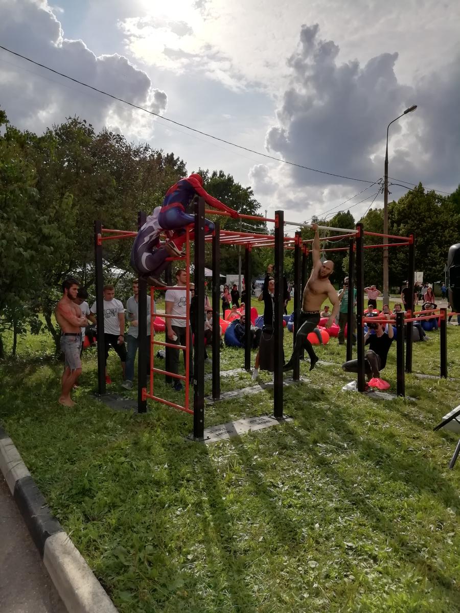 Человек, висящий на турнике, при мне подтянулся 118 раз за один подход и продолжил делать подтягивания дальше. Косплеер - Росомаха тоже принимал участие, правда за этим конкурсом и его результатами я особо не следил