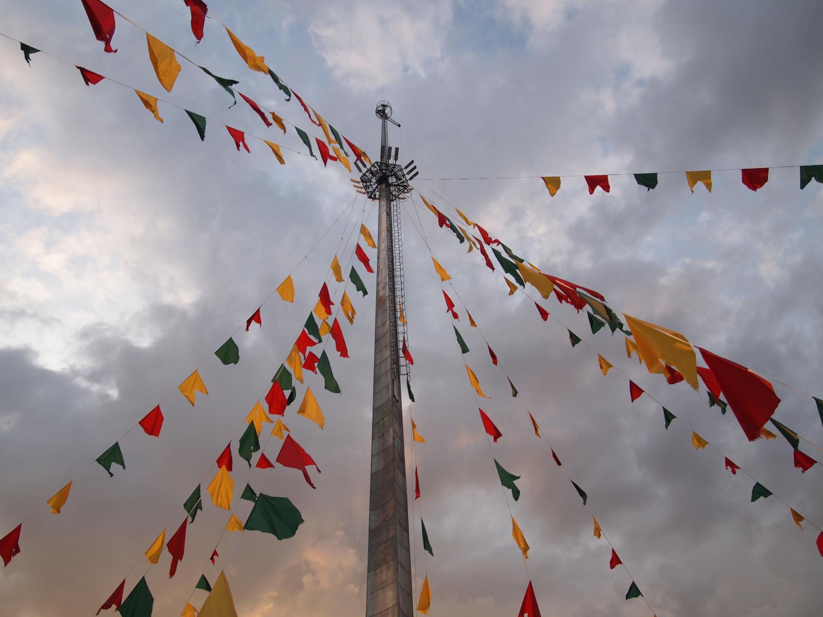 ... ну и расположенную перед Дворцом пионеров огромную стелу, украшенную канатами с огромными флажками