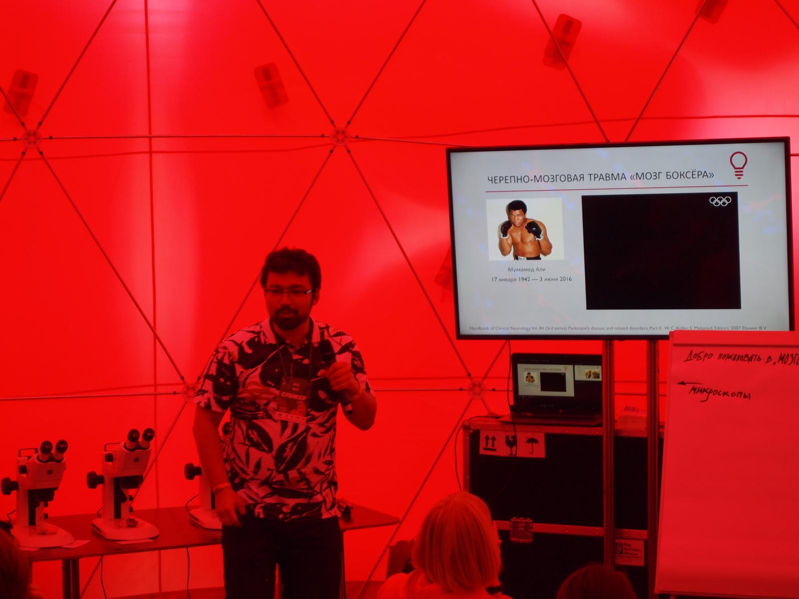 ...с некоторой натяжкой к таковым можно отнести аудиторию в виде гигантских мозгов, внутри которой тоже шли лекции. Внутри неё, закономерно, всё было залито кислотно-красным светом. Такое себе решение и с эстетической, и с практической стороны, если честно