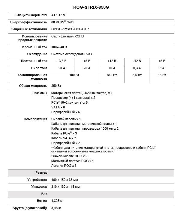 С подробными характеристиками ROG Strix 850W можно ознакомиться в таблицах ниже: