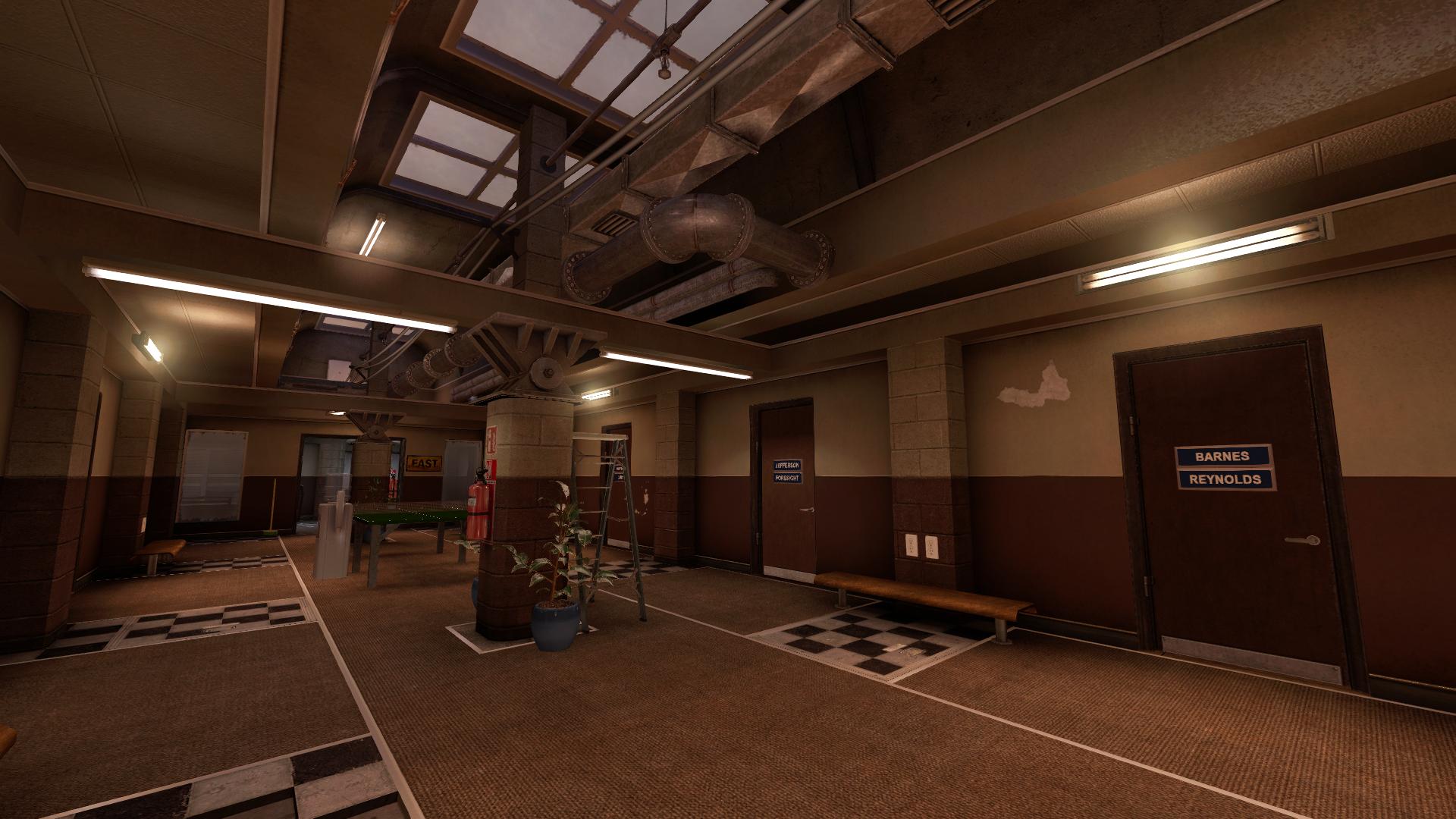 В этом зале ремонтируют вагончики монорельса. Все очень правдоподобно: вместо пустых длинных коридоров - функциональные помещения комплекса