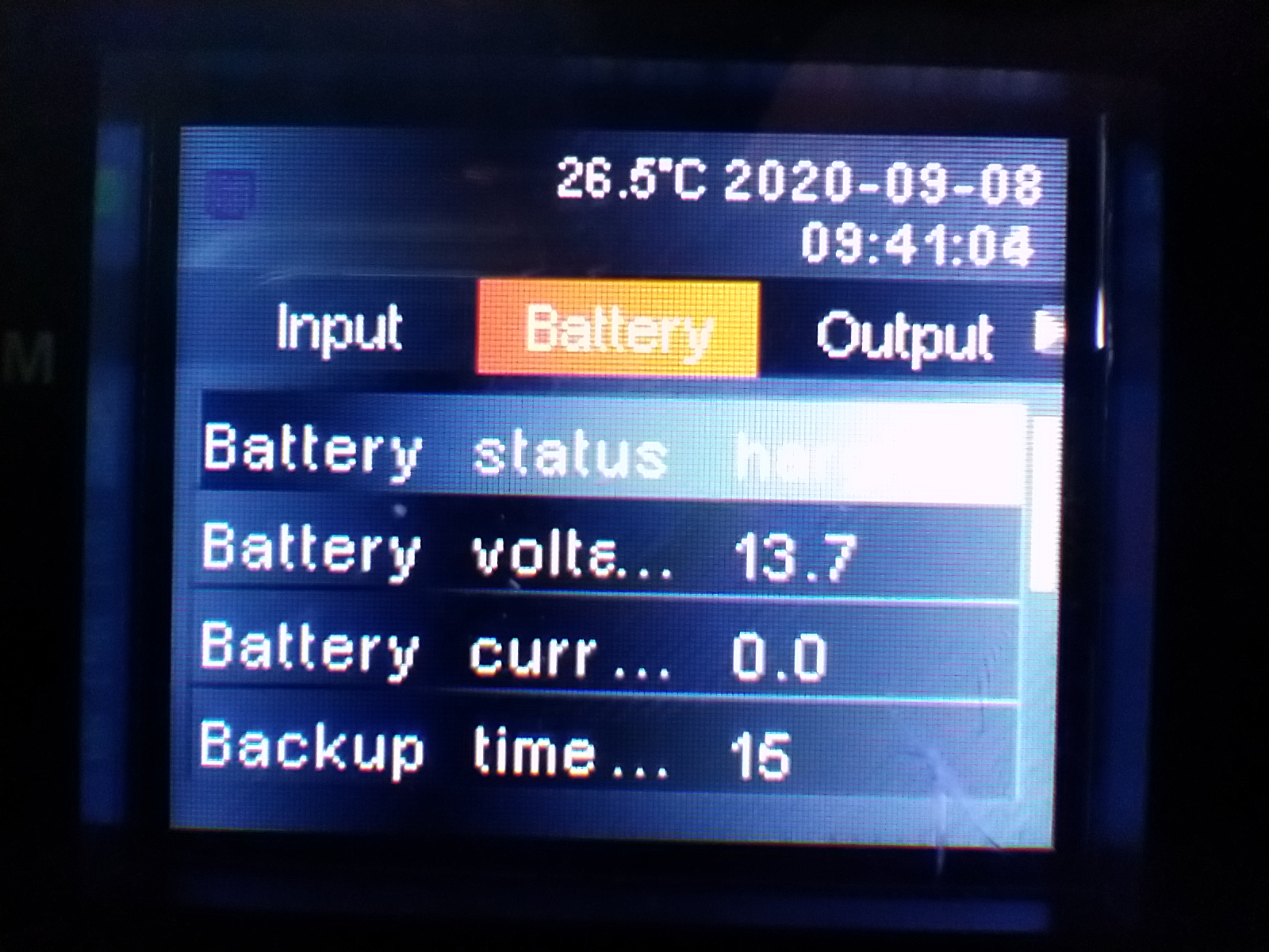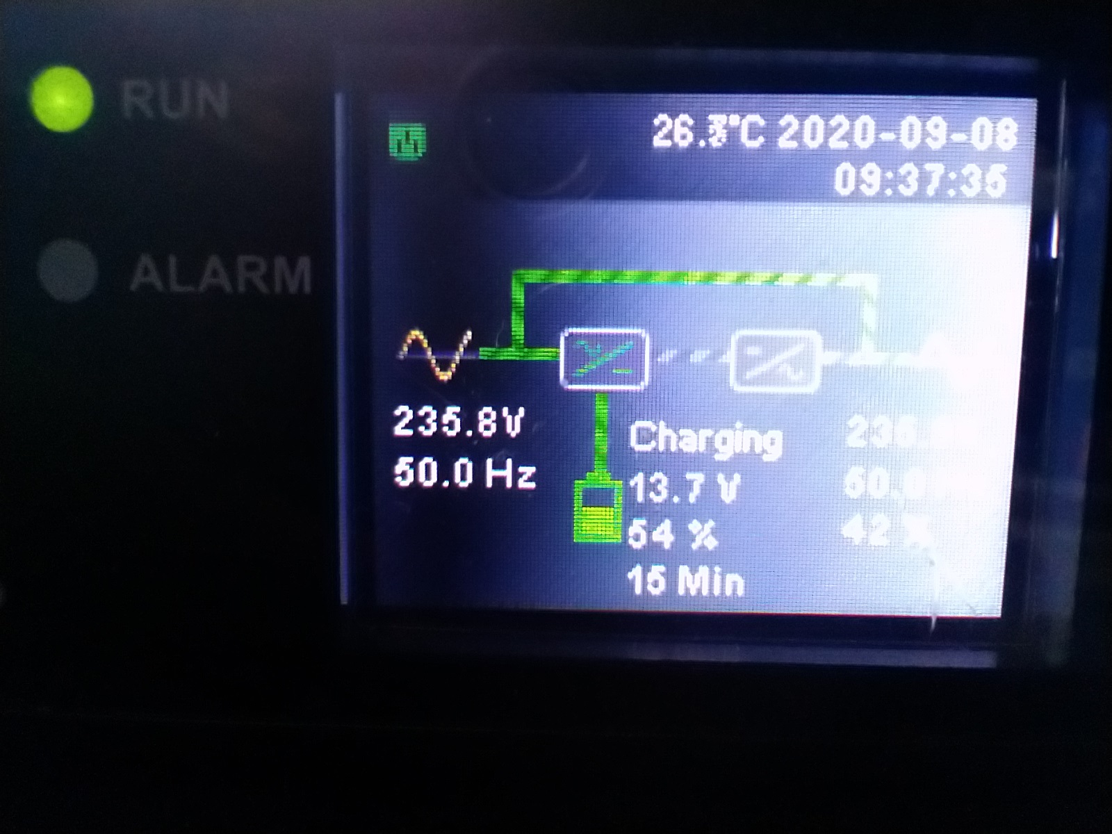 В сети пропал ток, нагрузка запитана от батарей, происходит их разрядка. Горит красная лампа "Alarm". Нагрузка потребляет 50% максимально возможной мощности ИБП, при заряде 56% батарей хватит на 15 минут