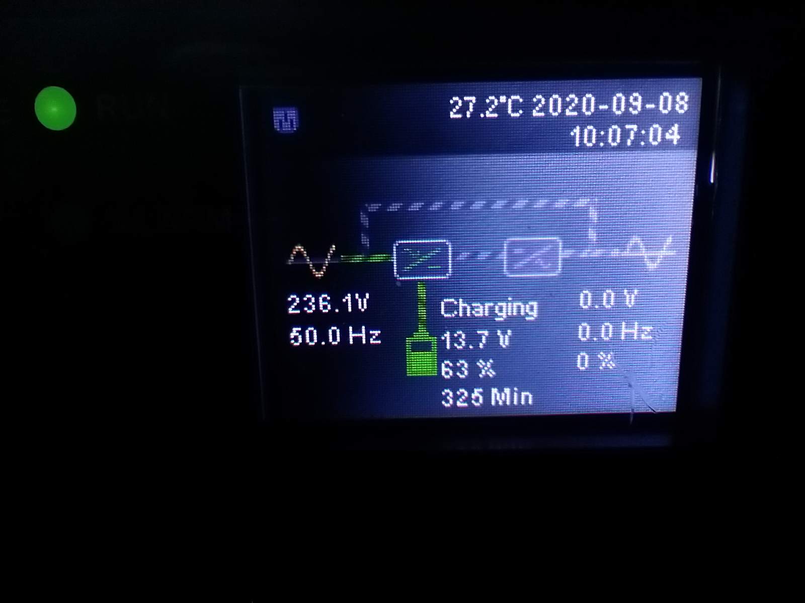 Нагрузка отключена, мощность не потребляется, идет зарядка батарей ИБП