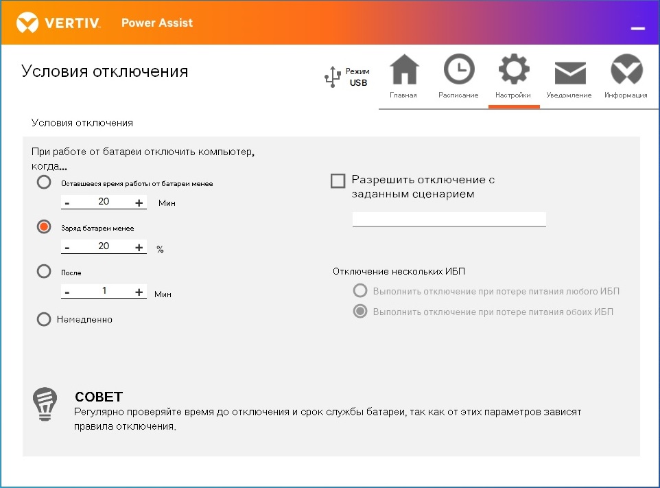 Из возможностей для подключения у источника бесперебойного питания Vertiv Edge-500IRM1U имеются входной разъём питания и шесть выходных розеток, половина из которых – программируемые. Можно настроить оборудование так, что в случае отключения электроэнергии будут автоматически выключаться розетки, к которым подключено не критичное оборудование, такое, как принтер или плоттер. При этом продолжит работать ПК и монитор, чье функционирование от заряда батарей будет обеспечиваться дольше при такой схеме. Это был простой пример. А общий смысл в том, что, в зависимости от конкретных сценариев использования, возможно отключение менее важного оборудования ради того, чтобы обеспечить большее время функционирования от батарей ИБП более важных компонентов сети. Есть порт для подключения комплектного кабеля USB с коннектором типа B для подключения ИБП к компьютеру и конфигурирования/мониторинга его параметров через фирменное программное обеспечение Vertiv Power Assist, скачать которое бесплатно (но не без регистрации) можно с официального сайта компании. Это также позволяет автоматически отключать ПК в штатном режиме при отключении электроэнергии на входе в ИБП, если ПК запитан от его батарей.