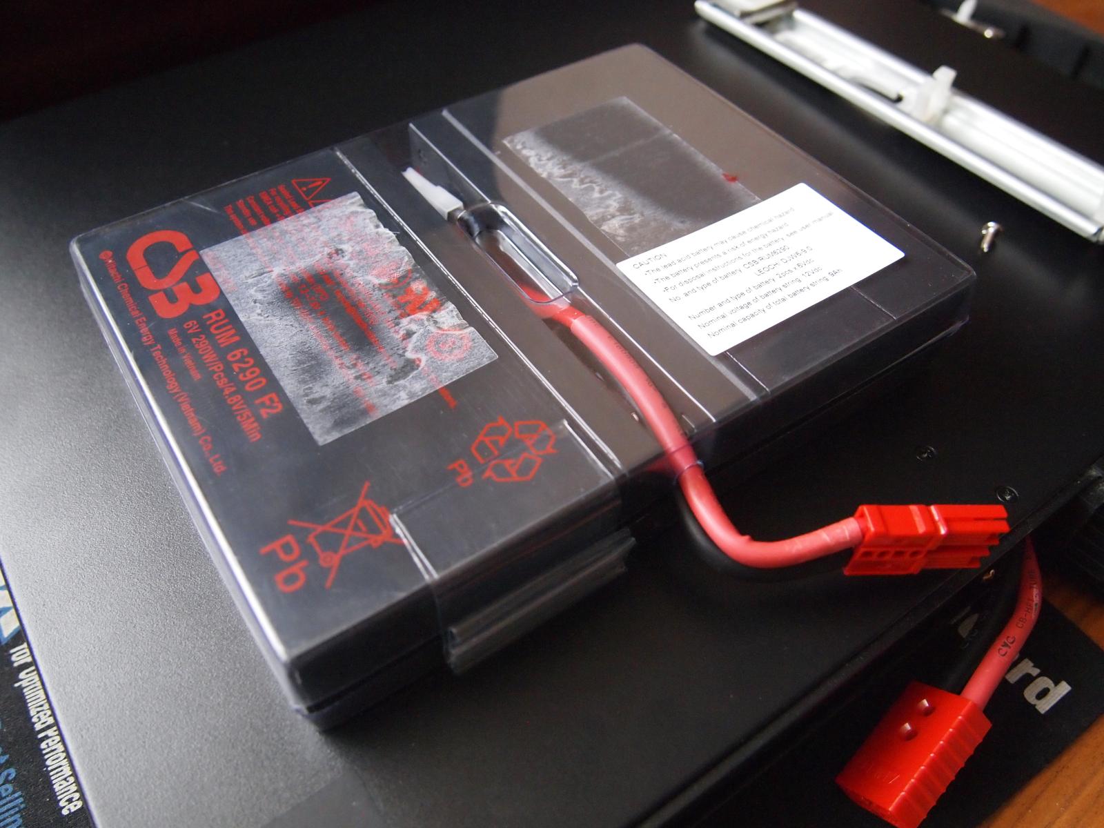 Чтобы заменить батареи, надо снять не только декоративную внешнюю пластиковую панель, но и открутить металлическую пластину под ней, предварительно разомкнув коннекторы на выведенных наружу через неё проводах. Затем можно будет извлечь из корпуса аккумулятор, представляющий из себя спарку из двух батарей типа RUM 6290 F2.