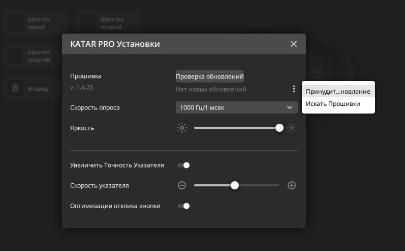 Настройка устройства - в данном пункте можно обновить прошивку мышки, задать скорость опроса, выбрав между значениями 125 Гц/8 мс, 250 Гц/4 мс, 500 Гц/2 мс, 1000 Гц/1 мс, отключить RGB подсветку колёсика (выполнено в виде ползунка “Яркость”, которая регулируется только в двух положениях - 0% и 100%, что несколько странно), также тут ещё несколько настроек, практической пользы от которых лично я не заметил. В процессе обновления прошивки мышки она перестанет работать, а чтобы она заработала снова, её надо будет переподключить к USB порту, но об этом выскочит уведомление.