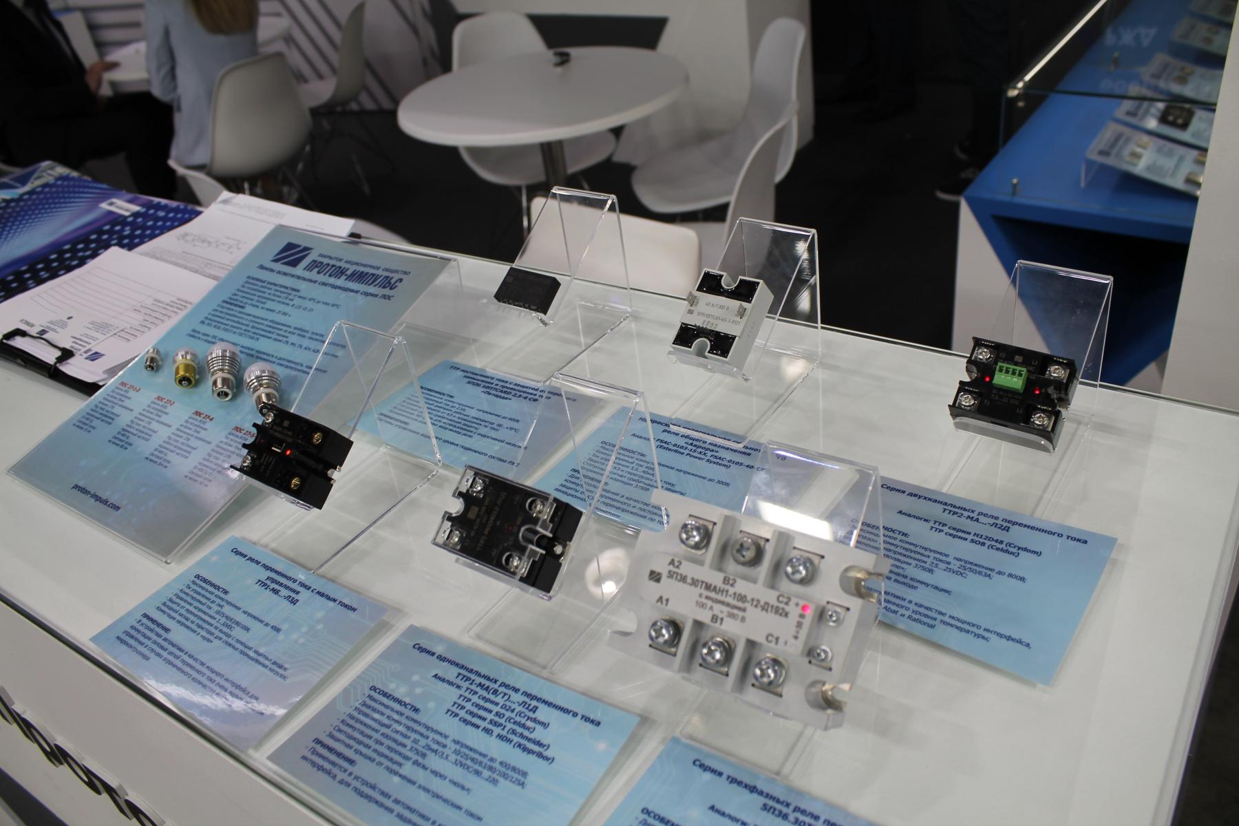 А вот на стенде российской компании ЗАО “Протон-Импульс” моё внимание привлекли достаточно крупные и явно больше похожие на электротехнические, чем на электронные, компоненты в виде прямоугольных пластиковых коробочек. Представитель компании Александр Кургин охотно рассказал, что на самом деле это достаточно высокотехнологичная продукция - твердотельные реле, выпущенные в рамках импортозамещения аналогичной продукции от ведущих мировых производителей, таких как Crydom, Schneider Electric, Siemens и OMRON. Александр Александрович, на лацкане пиджака которого красовался небольшой значок с двуглавым орлом, не без гордости отметил, что продукция не уступает, а в некоторых аспектах получилась даже лучше импортных аналогов, с поставками которых сейчас возникли проблемы из-за санкций.