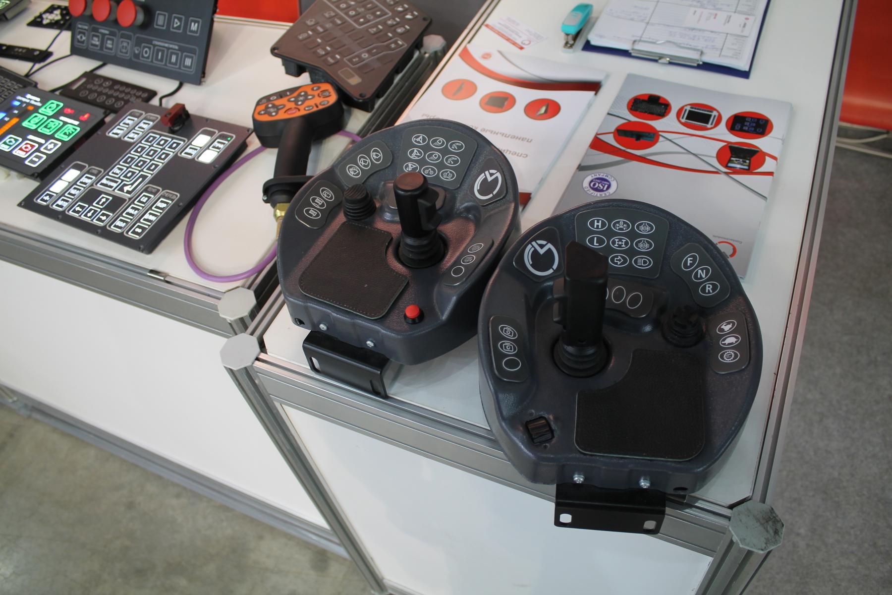 На некоторых стендах можно было увидеть готовые образцы различных манипуляторов и панелей управления для спецтехники. На фото ниже, например, представлены органы управления для лесозаготовительного комбайна производства минского НПП “Контактмодуль”. Если честно, подумал сначала, что это что-то из органов управления пассажирской авиации, сейчас встречаются такие компоновки места пилота, где штурвал в виде относительно небольшого джойстика сбоку.