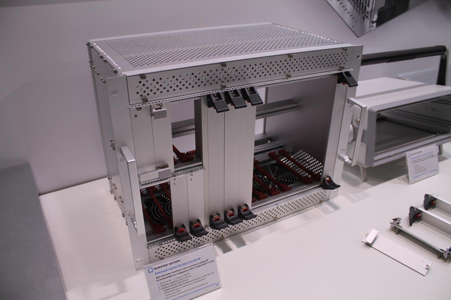 На одном из стендов были представлены варианты корпусов для монтажа различного электронного оборудования производства российской компании “Инженер-Дизайн”. Пообщавшись с представителями, узнал, что возможно изготовление металлических корпусов как под заказ под различное уникальное лабораторное оборудование, так и более типовые решения, например, серверные модули форм-фактора для монтажа в стойку.