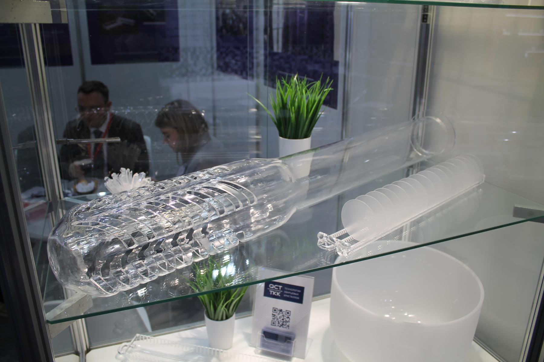 А вот чего я не ожидал, если честно, увидеть на данной выставке, так это изделия из стекла. Как оказалось, стекла не простого, а кварцевого. Так, представленный на фото ниже объект, напоминающий всем своим видом ракетницу из игры Quake III, оказался одной из двух изготовленных зеленоградской компанией QCT / ТТК (”Технологии Кварцевых Кристаллов”) по заказу целлюлозного комбината деталей для кислотного реактора.