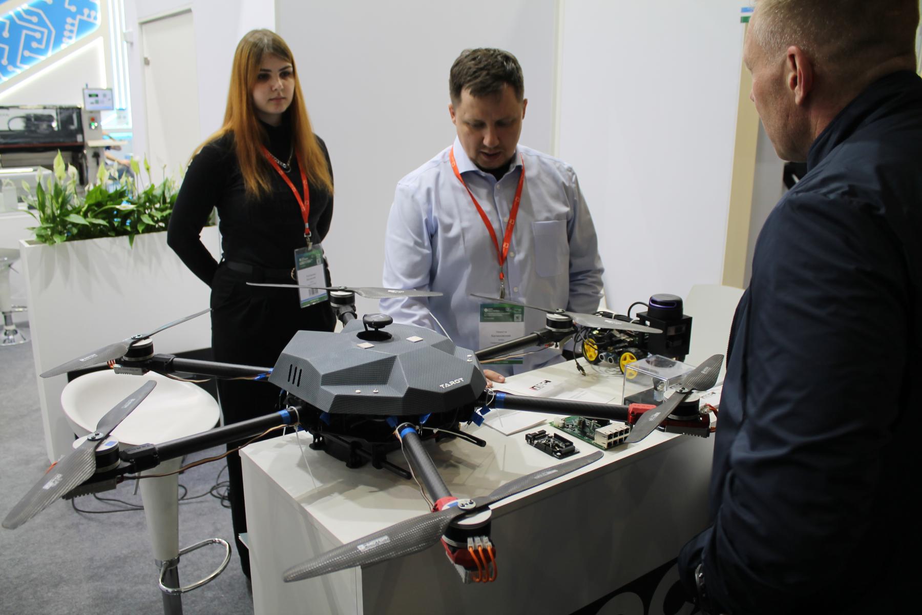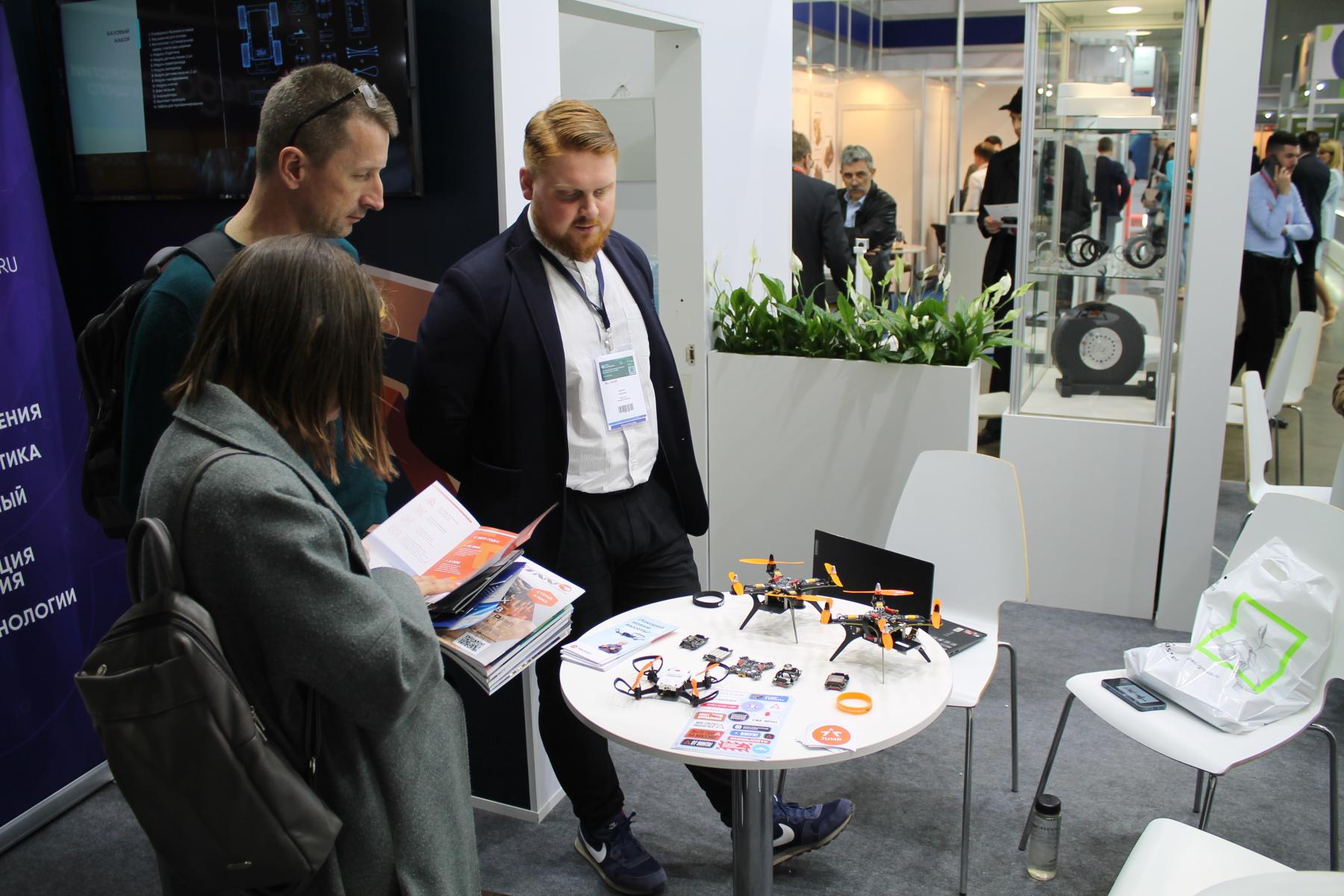 Неподалёку расположилась весьма интересная зона с квадрокоптерами. Сначала думал, что тут представлены китайские образцы, но оказалось, что всё это наши, российские разработки. И не ребрендинг, а разработка на уровне всей компоновки, печатных плат и программного обеспечения, только отдельные компоненты импортные. Несколько небольших моделей семейства “Пионер” представлены Санкт-Петербургской компанией “Геоскан”, а одна из них, Geoscan Pioneer-Mini, и вовсе крохотная.
