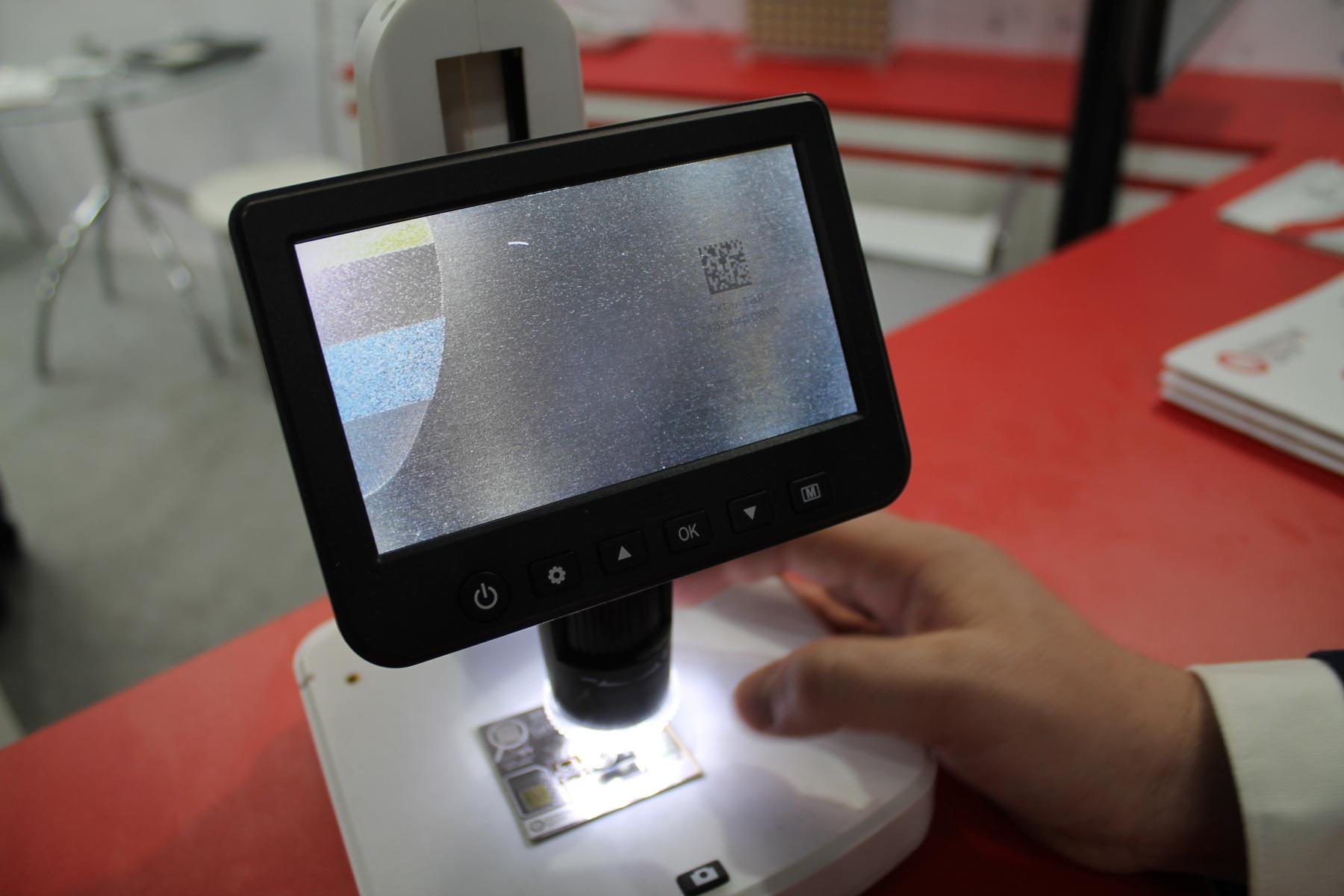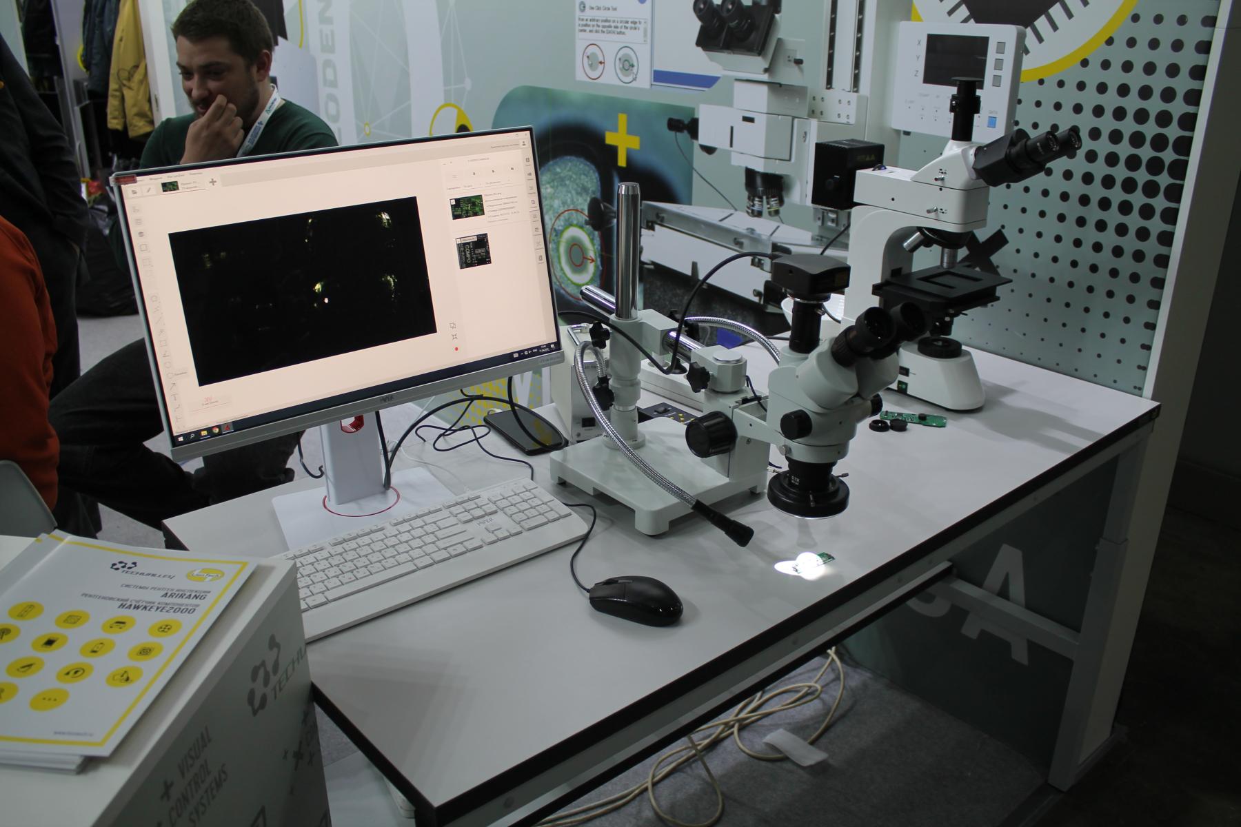 А тем временем, время работы выставки уже подходило к концу. Через расположенный рядом проход я решил по-быстрому заглянуть в соседний зал, где, как уже писал, проходила выставка измерительного и лабораторного оборудования “Аналитика Экспо”. К слову, многие стенды там уже явно прекращали свою работу. Недалеко от входа моё внимание привлёк интересный комплекс из лабораторного оборудования с микроскопом, подключенным к компьютеру.