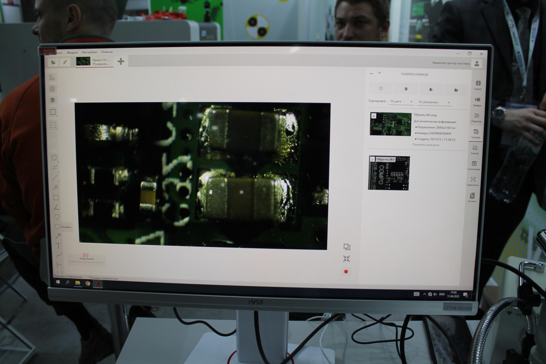 Инженер компании Lion Tech Илья Сметанин с энтузиазмом рассказал о том, что здесь представлен программно-аппаратный комплекс с использованием отечественного ПО, позволяющего корректировать выводимое с электронного микроскопа изображение а также проводить некоторые измерения и автоматизировать поиск дефектов.