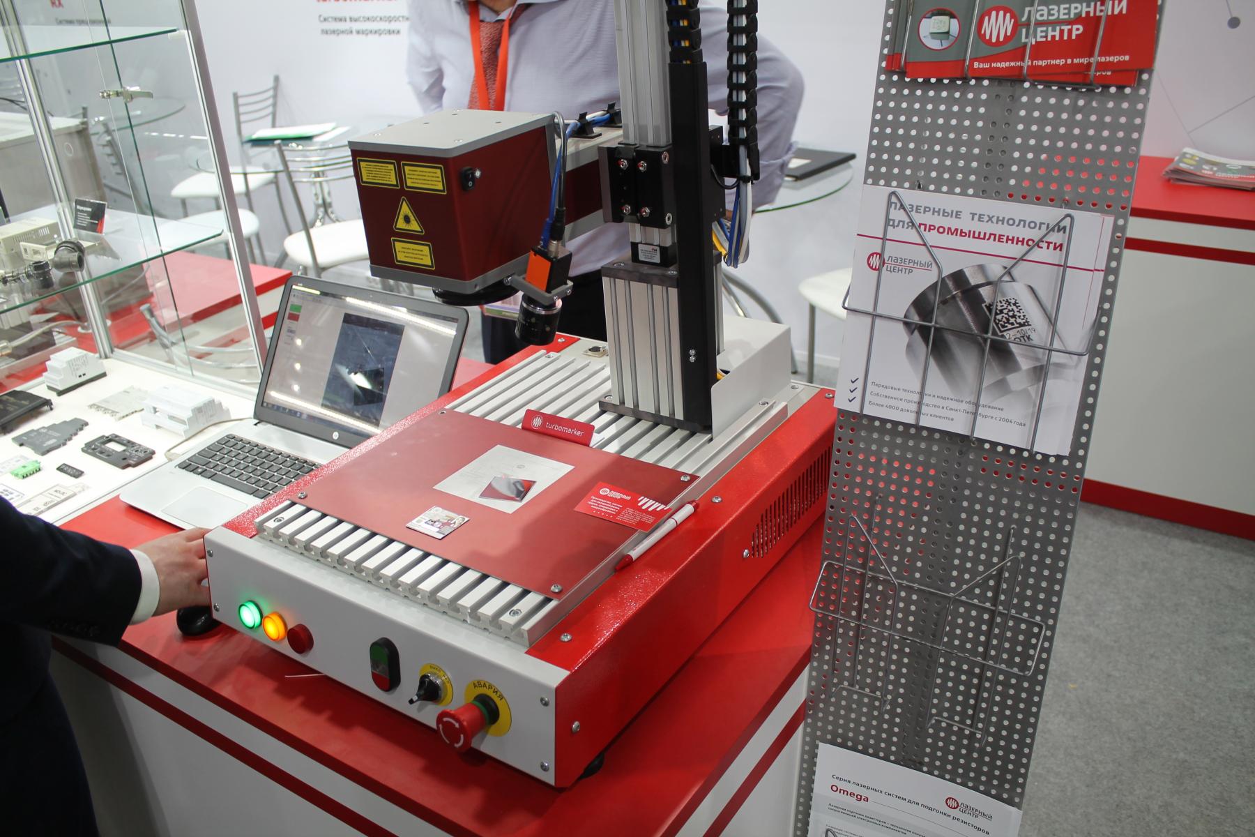 Напоследок, я подошел к расположенному у самого входа стенду петербургской компании “Лазерный Центр”, который я заприметил с самого начала. Я помню эту контору ещё по выставкам 2016-2017 годов, тогда мне сильно запомнилась наглядная демонстрация работы их достаточно компактных станков лазерной маркировки и гравировки, которые буквально при мне менее чем за минуту разместили на стальной пластинке различные типы изображений, надписей и QR-кодов, в том числе цветных - за счёт управления режимом работы лазера, позволяющего получить тот или иной цвет побежалости на металле. Да, цветность тут конечно весьма условная, но на логотип Microsoft или Google вполне себе хватит.
