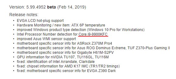 Также несколько дней назад в списке изменений присутствовала строка о добавлении поддержки для процессора Core i9-9900KFC, что породило немало шуток касательно последних трёх букв в названии продукта, однако сейчас эта информация в списке отсутствует. Остаётся загадкой, действительно ли данный процессор появится в ассортименте Intel, либо же это была банальная опечатка.