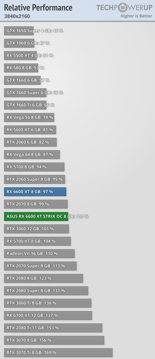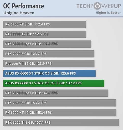 Также стоит отметить, что, благодаря заводскому разгону, уровень производительности ASUS Radeon RX 6600 XT STRIX OC оказался на несколько процентов выше по сравнению со стандартной моделью RX 6600 XT.