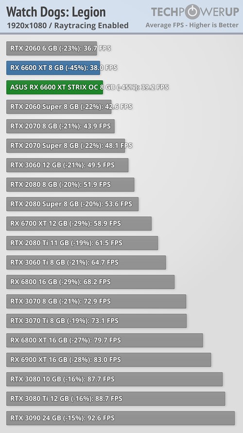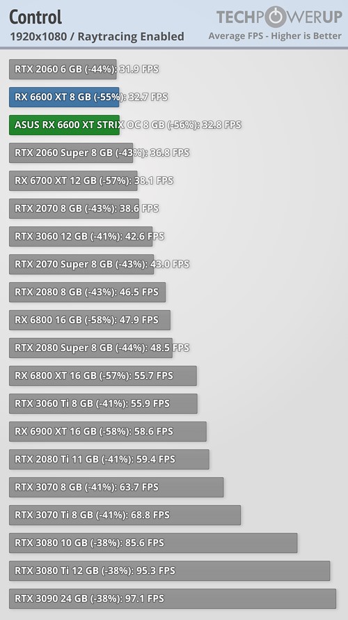 Быстродействие при активации рейтрейсинга традиционно не является сильной стороной продуктов AMD, поэтому немудрено, что Radeon RX 6600 XT ощутимо уступила моделям от NVIDIA в данной дисциплине: при разрешении 1920x1080 в Metro Exodus разрыв между новинкой и её соперницей в лице RTX 3060 не слишком велик, в то время как в Watch Dogs: Legion и Control весьма ощутим. Впрочем, внедрение функции FidelityFX Super Resolution может исправить данный недочёт видеокарт «красной команды».