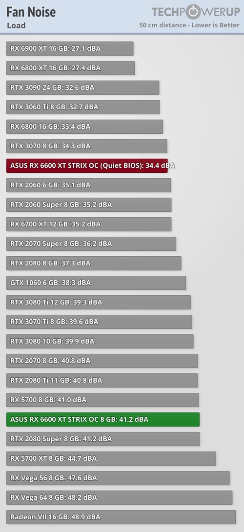 Температура GPU и «горячей точки» для ASUS Radeon RX 6600 XT STRIX OC во время игрового процесса при задействовании производительного режима BIOS составляет 59 и 81 °C при достаточно высоком уровне шума в 41.2 дБА, однако активация тихого режима BIOS позволяет снизить данное значение до 34.4 дБА при температурных показателях GPU и hotspot в 65 и 87 °C.