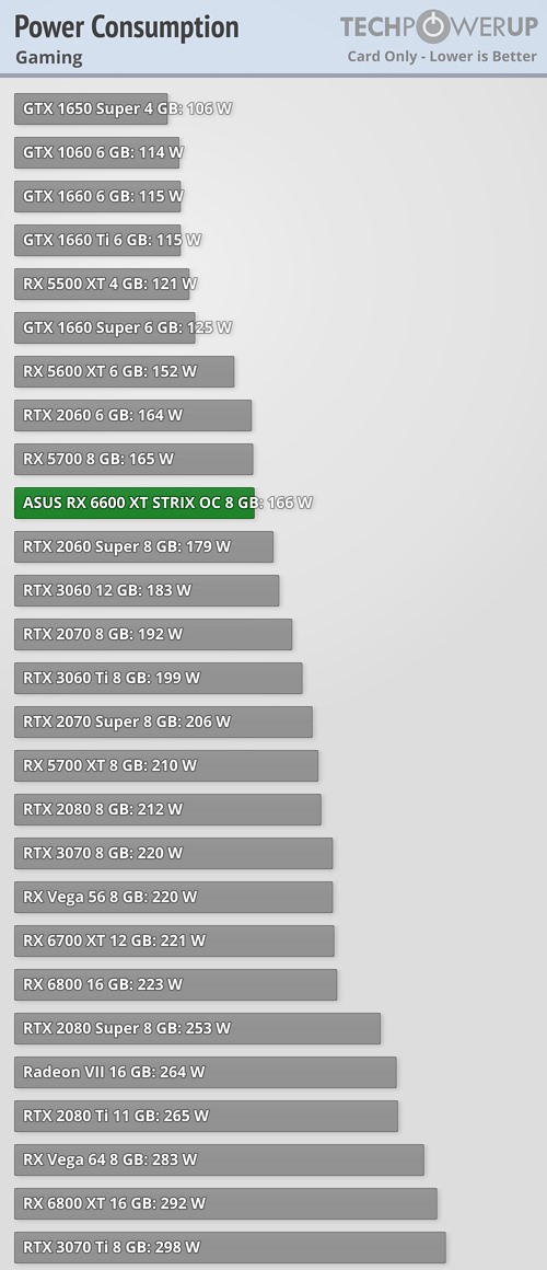 Уровень энергопотребления RX 6600 XT на фоне предшественниц и конкуренток весьма неплох: в процессе игры новинка потребляет около 166 Вт.