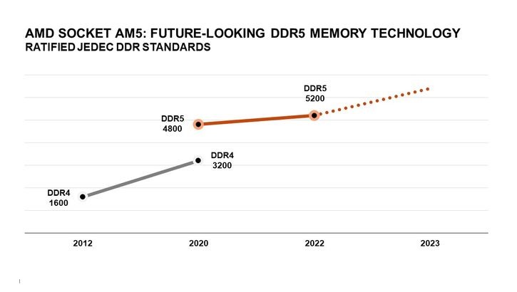 Не обошлось и без сравнения количества линий PCIe 5.0 у конкурирующих продуктов: как отметил представитель AMD, платформа Socket AM5 может предложить до 24 линий PCIe 5.0, что позволяет исключить ограничение пропускной способности будущих графических адаптеров и твердотельных накопителей, наделённых новой версией интерфейса, в то время как при одновременной установке видеоадаптера и накопителя материнские платы Intel LGA 1700 сокращают количество используемых линий для видеокарты до восьми, что уменьшает пропускную способность на 50 %.
