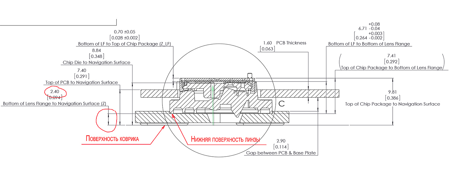 3. В большинстве современных мышей производители ставят сенсоры на одинаковую высоту. Эта высота определяется расстоянием от рабочей поверхности (коврик) до нижней поверхности линзы и составляет 2.4мм.