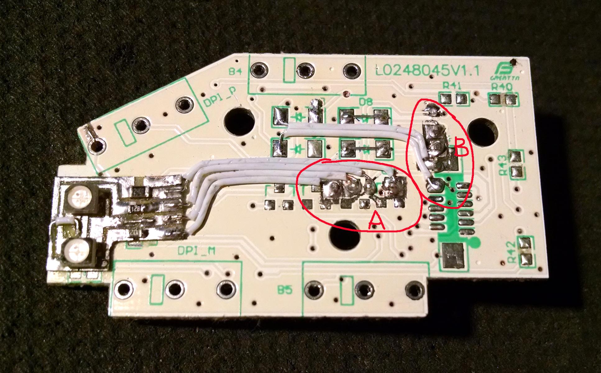 Далее были установлены кнопки D2FC-F-K(50M) (заказчик решил заменить на них вообще все кнопки в мыше), заменен RGB светодиод на такой же, но с более длинными выводами, чтобы можно было подсвечивать матовую вставку вокруг колеса. Выполнена разводка кнопок на разъем.