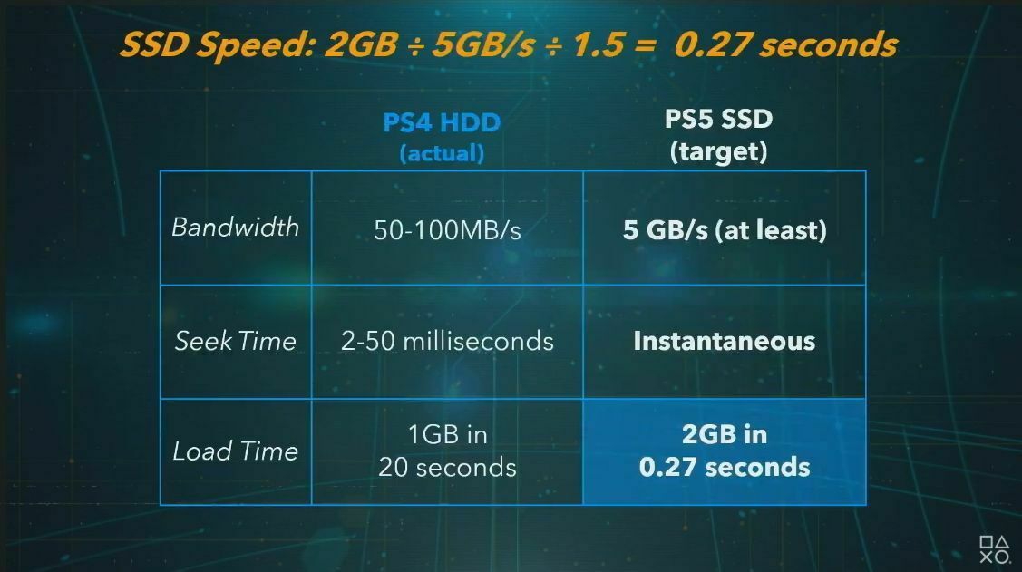 Генеральный директор Sony Кеничиро Йошида указал, что встроенный в PS5 кастомный SSD обеспечит скорость обработки, которая намного превосходит ту же скорость в PlayStation 4. Также Йошида добавил, что с помощью специально разработанного высокоскоростного твердотельного накопителя они планируют реализовать скорость обработки игровых данных примерно в 100 раз выше, чем у PS4. Время загрузки игры должно быть намного короче, чтобы игроки имели возможность перемещаться по огромным игровым мирам практически мгновенно.