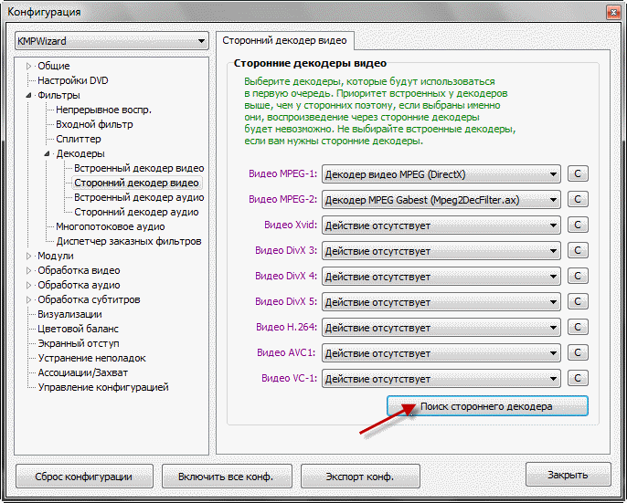 4. Отключаем декодеры плеера.