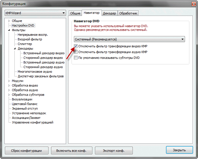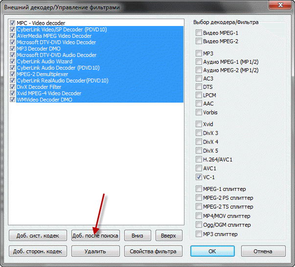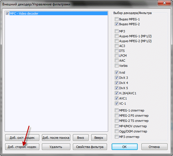 1. Подключаем системный декодер. Нажимаем на “Доб. сист. кодек” и выбираем Microsoft DVT-DVD Video Decoder или делаем как на скрине (авто поиск).
