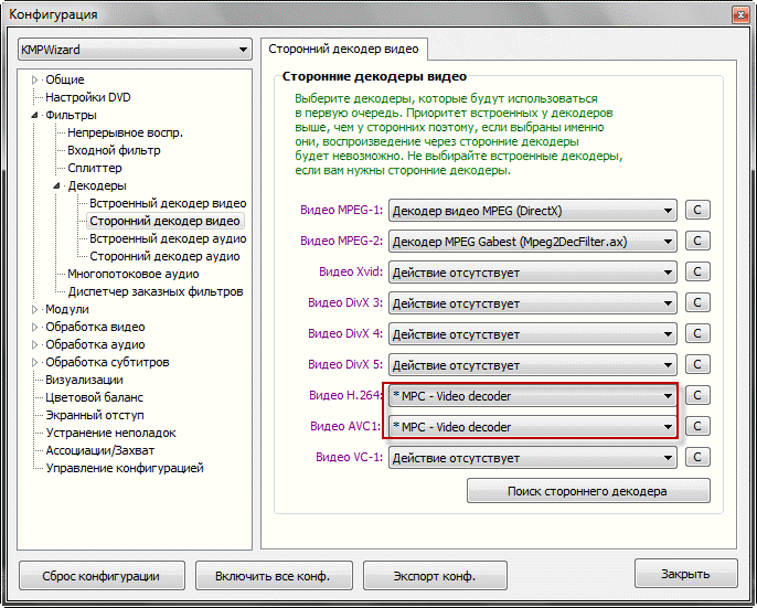 3. Выбираем MPC – Video decoder для H.264 и AVC1.
