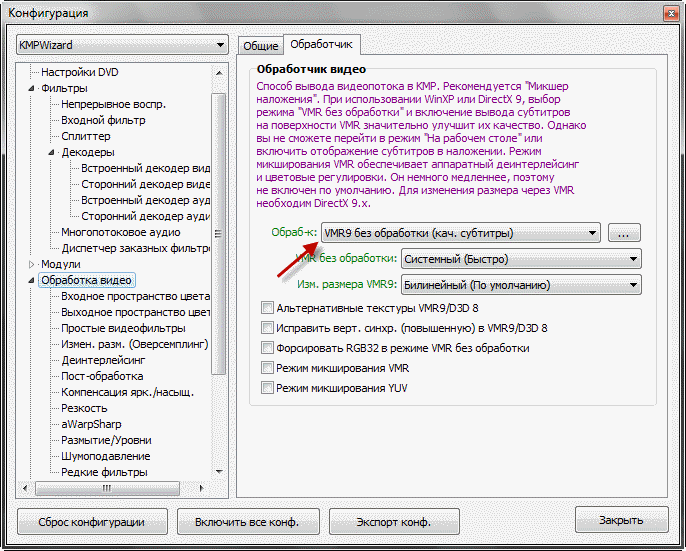 5. Меняем обработчик на VMR9 без обработки.