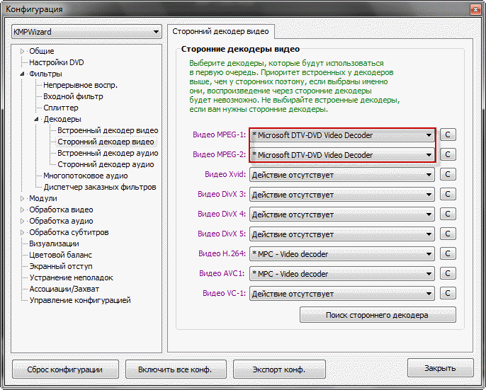 2. Меняем декодер на Microsoft DVT-DVD Video Decoder.