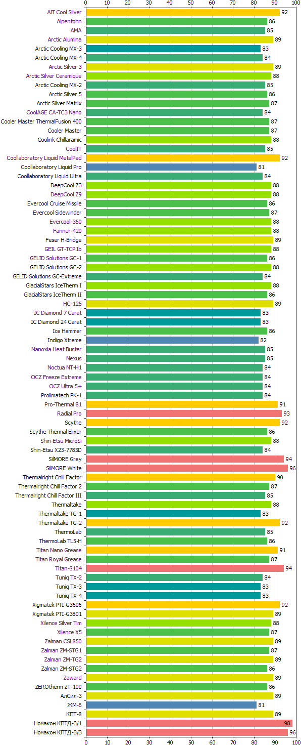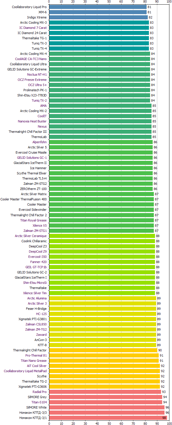За основу взята шкала из моих двух последних статей*. Результаты термопаст из всех остальных материалов приводились к ней же при помощи линейной экстраполяции на основе двух точек, полученный результат округлялся до целых.