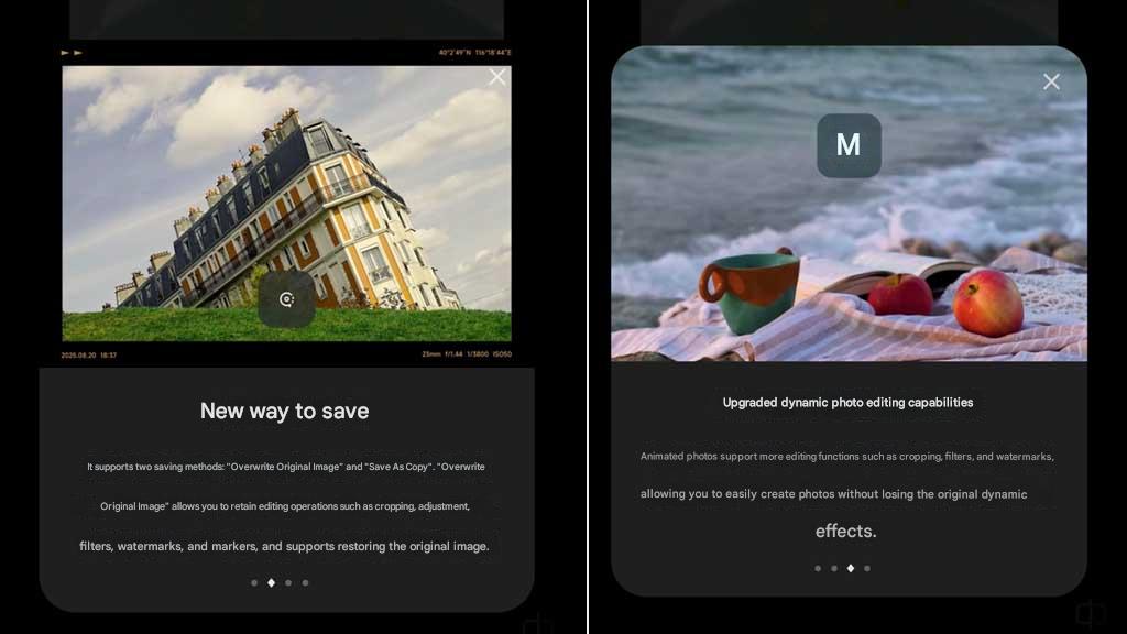 Xiaomi начала масштабировать обновление встроенного фоторедактора для операционной системы HyperOS 3. В новой версии реализованы два способа сохранения файлов: перезапись оригинала с возможностью отката изменений и сохранение копии. Функция перезаписи поддерживает сохранение данных о кадрировании, фильтрах и водяных знаках в обратимом формате, что позволяет вернуть исходное изображение в любой момент.