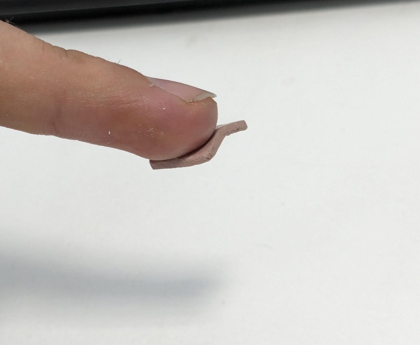 Термопрокладка довольно твёрдая и сухая, трудно мнётся и рассыпается. Цвет розовый, Размер 95х50мм,твёрдость 30-55 HS OO. Теплопроводность 15Вт/мК.