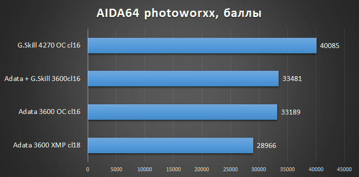 Весьма предсказуемые результаты, XMP-профиль показал себя довольно слабо, а 4 планки всегда лучше двух, особенно заметно преимущество в тесте копирования. Тест photoworxx выполнен с параметром "HT off".