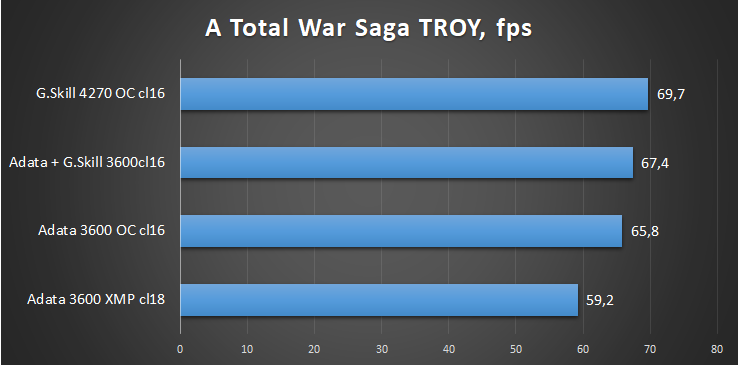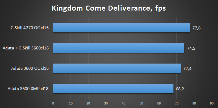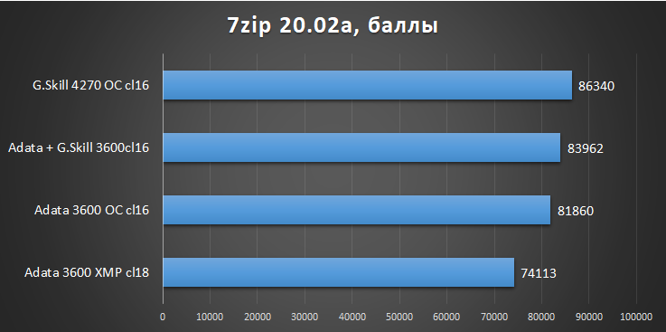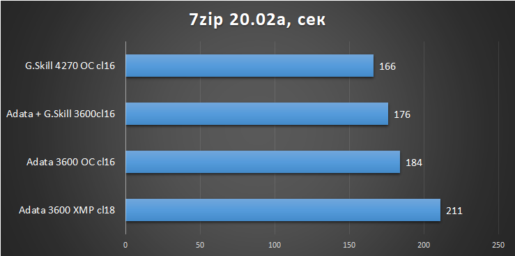В секундах получается достаточно наглядно. Разгон приносит ADATA 15% прироста производительности. 4 планки памяти подтверждают своё превосходство над двумя.