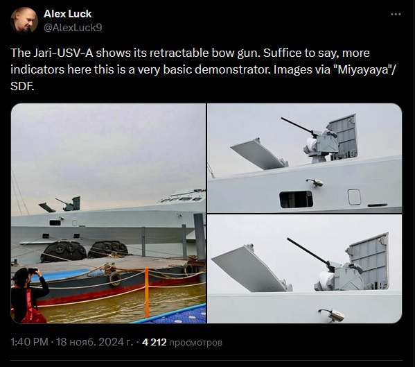 Это может быть экспериментальное орудие или пока просто макет. Имела бы смысл пулеметная пушка калибром 30 мм или скорострельная пушка чуть большего калибра. Их можно использовать не только против небольших кораблей, но и против воздушных целей с боеприпасами воздушного взрыва, включая дроны-камикадзе и ракеты.
