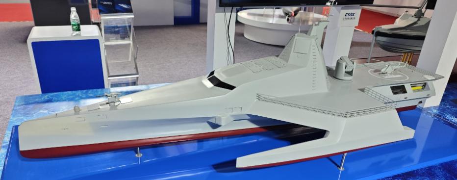 Модель Jari-USV-A, представленная на авиасалоне. На корме можно увидеть подводные дроны (желтые). Фото: Weibo